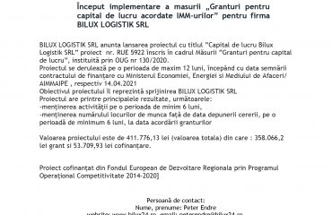 • Finalizare a masurii „Granturi pentru capital de lucru acordate IMM-urilor” pentru firma BILUX LOGISTIK SRL