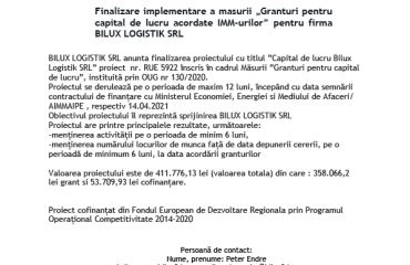 • Finalizare a masurii „Granturi pentru capital de lucru acordate IMM-urilor” pentru firma BILUX LOGISTIK SRL